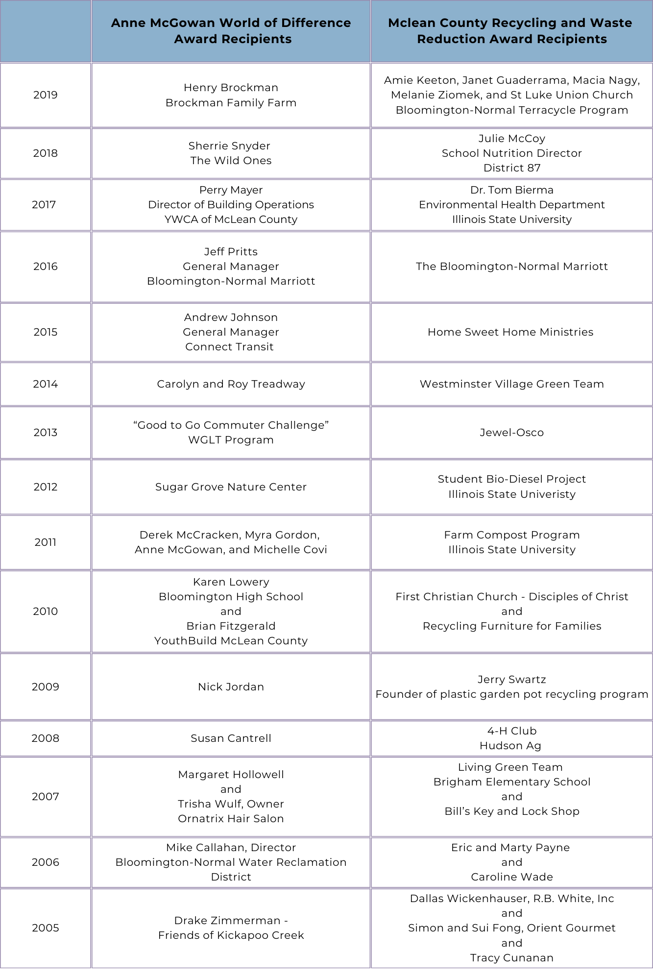 The McLean County Recycling and Waste Reduction Award identifies businesses, schools or organizations with outstanding recycling programs or waste reduction efforts. Nominations are accepted for any recycling or waste reduction project, but areas of growing interest include source reduction of hazardous wastes or zero-waste programs.