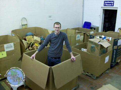 A person standing in a large cardboard box surrounded by other cardboard boxes full of different materials.