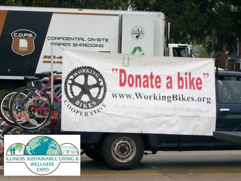 A truck advertising bike donations for the Working Bikes Cooperative at the Illinois Sustainable Living and Wellness Expo.