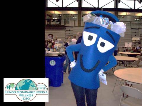 A person dressed as a recycling mascot wearing a felt recycling bin costume.