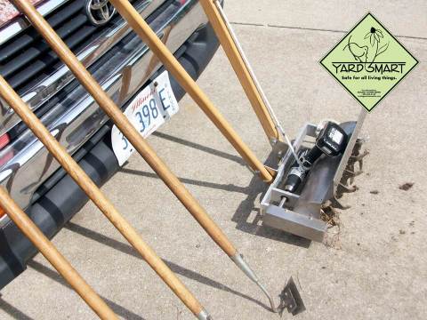 Yard Smart lawn tools learning against a car.