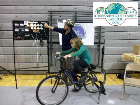 A girl riding a bike to generate electricity at the Illinois Sustainable Living and Wellness Expo.