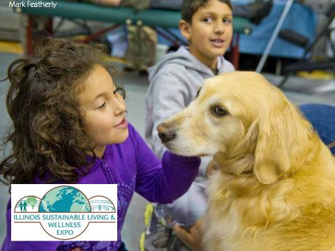 A girl smiling at a dog at the Illinois Sustainable Living and Wellness Expo.