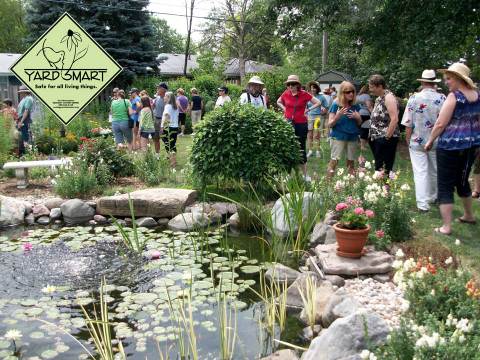 A group of people walking through a flower garden as part of the Yard Smart Garden Walk.