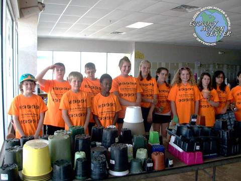 A group of students at an educational event hosted by the Ecology Action Center standing behind a table with planting pots.