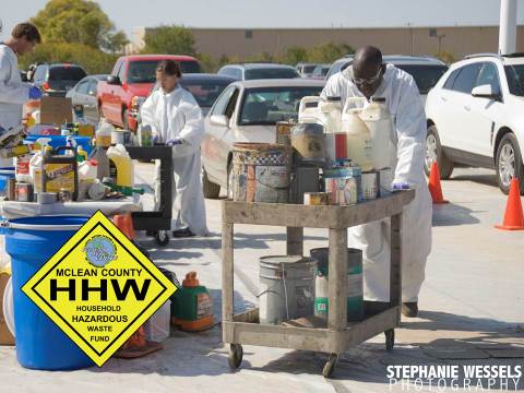 A worker at the McLean County Household Hazardous Waste disposal event pushing a cart full of paint cans and other materials for disposal.