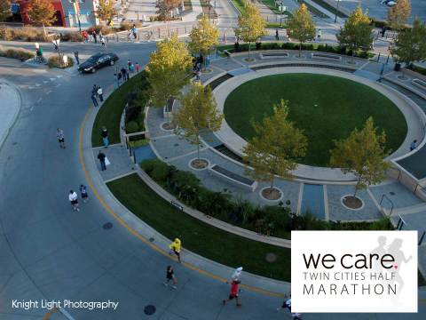 A birds-eye view of people running around Uptown Circle for the We Care Twin Cities Marathon.