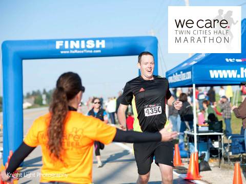 A volunteer for the We Care Twin Cities Half Marathon holding out her hand to congratulate a participant running through the finish line.