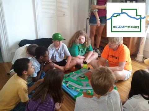 An educational program held at the Ecology Action Center. The education specialist sitting with students around a model of roads and watersheds.