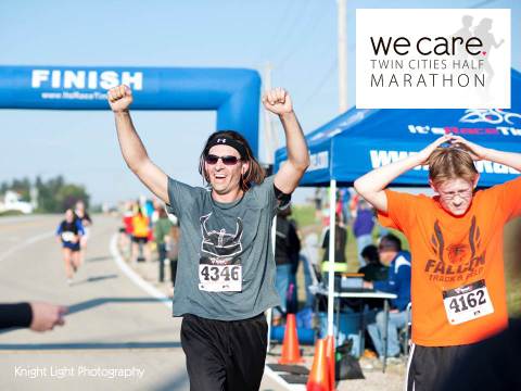 A smiling participant in the We Care Twin Cities Half Marathon running under the Finish arch with his arms raised.