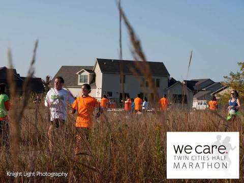 A group of people running on a trail as part of the We Care Twin Cities Half Marathon.
