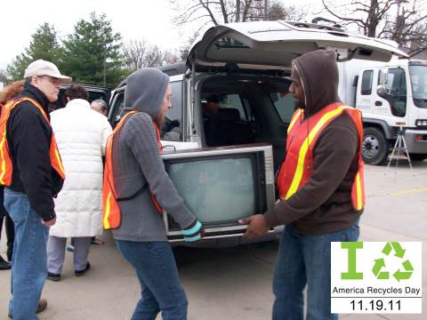 Two people carrying an old TV for a waste disposal event on I Recycle, America Recycles Day.