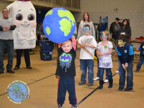 An educational EAC program showing three students with their faces painted and one student holding a model of the Earth above his head. There is also a mascot wearing a costume of a large milk carton.